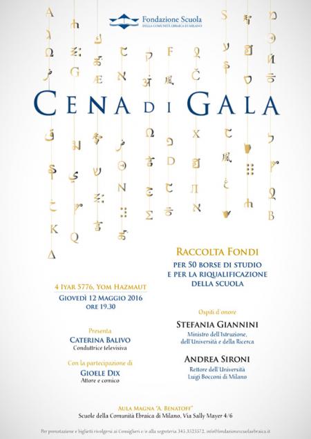 Quasi 500 ospiti per l'edizione 2016 organizzata il 12 Maggio, data che coincideva con Yom Hazmaut . La serata, infatti, è iniziata con la proiezione del video originale della lettura della dichiarazione d’indipendenza di David Ben Gurion nel 1948, letta poi in italiano da uno studente dei licei. Subito dopo, sulle note di Gam Gam, gli allievi della quarta elementare, della seconda media e alcuni di quinta liceo, di bianco vestiti e con un palloncino in mano, sono entrati dai vari lati dell’Aulla Magna girando tra i tavoli e facendo emozionare tutti i presenti anche con il canto dei due inni nazionali.